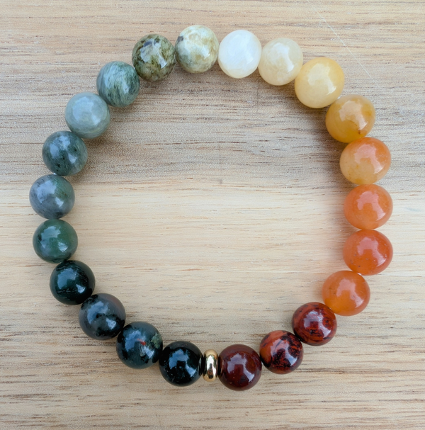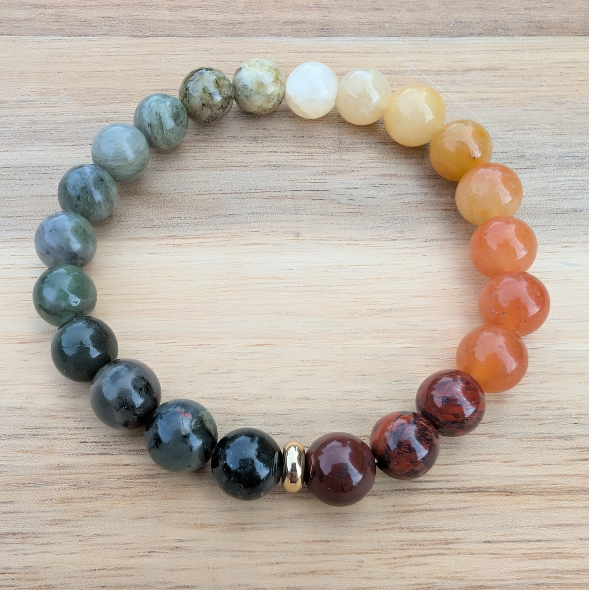 This 8mm natural gemstone change of seasons inspired bracelet features: