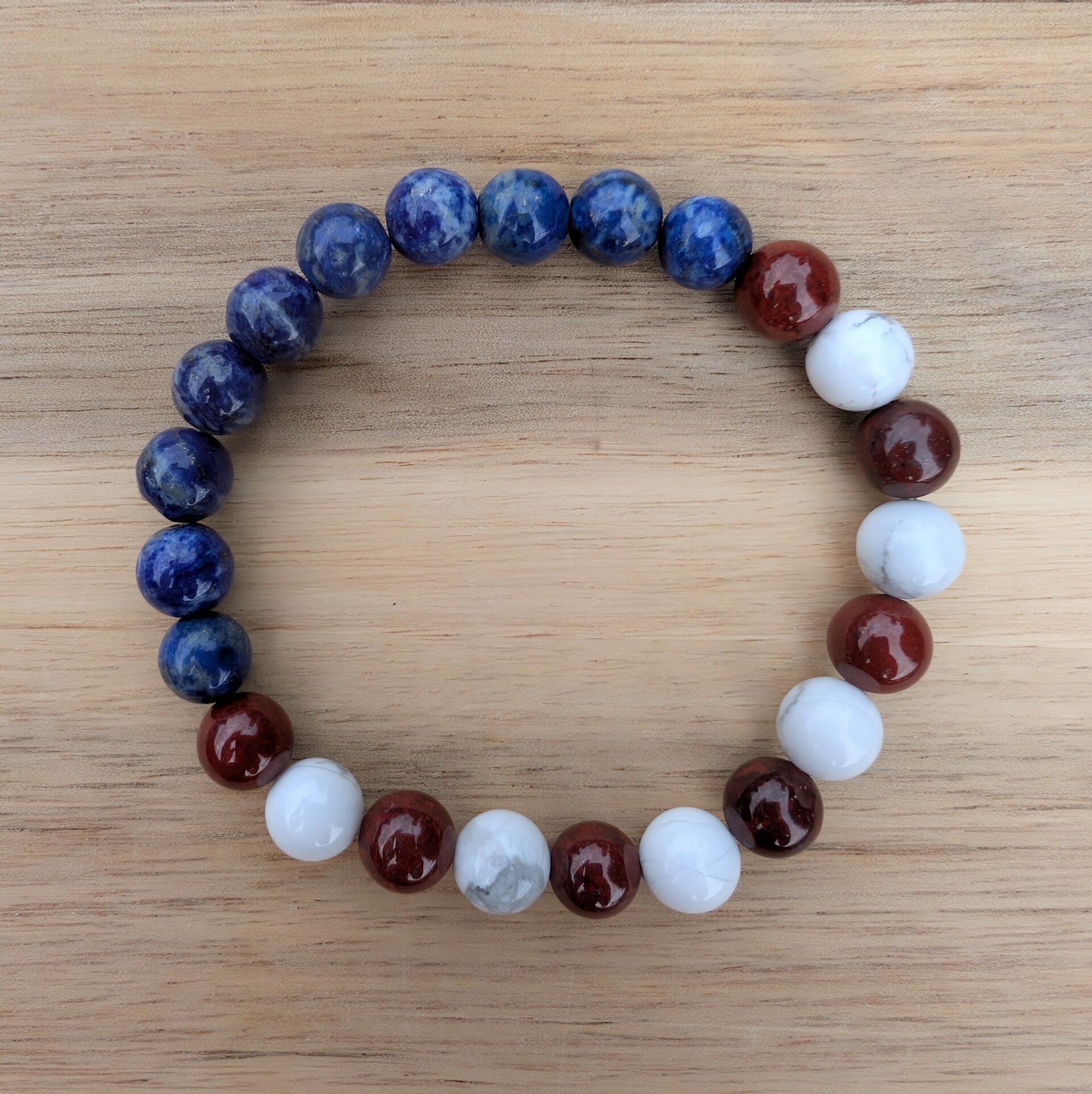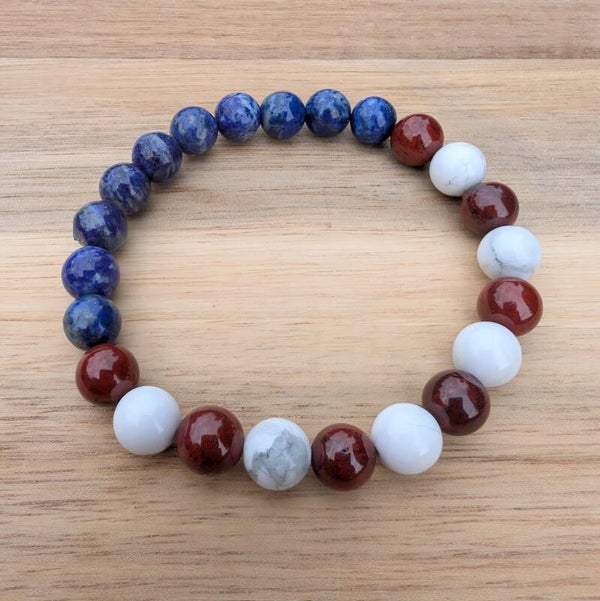 This patriotic 8mm natural gemstone American flag inspired bracelet features: