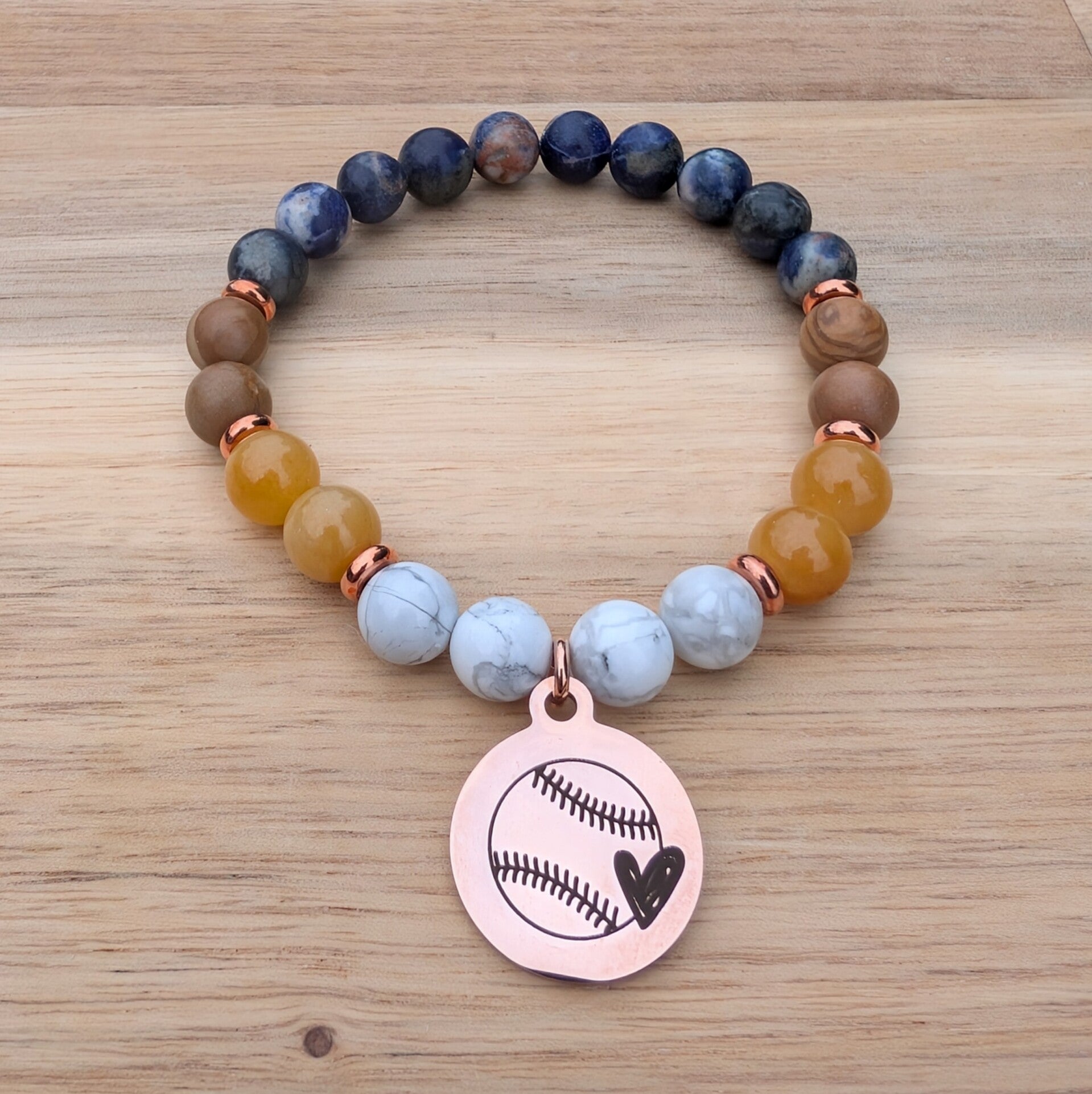 Baseball Charm with Howlite, Golden Jade, Tigerskin Jasper, and Orange Sodalite