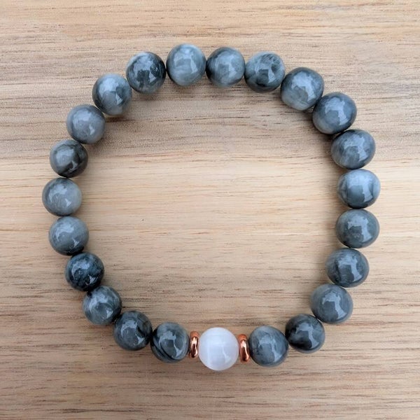 This 8mm natural gemstone bracelet features: