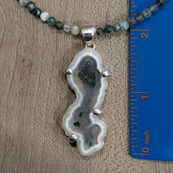 - Moss Agate slice pendant - approximately 1.5"x0.5" in size, pendant is wrapped and mounted with Sterling Silver